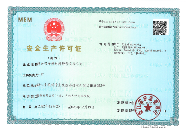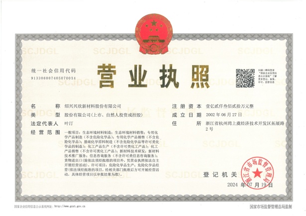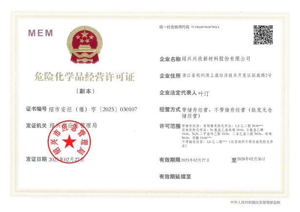 紹興興欣新材料股份有限公司成立于2002年06月27日,占地面積122畝,位于杭州灣上虞經濟技術開發(fā)區(qū)拓展路2號,現有職工200余人,專業(yè)技術人員50余人;博士、碩士研究生30余人組成的一支知識型、專業(yè)化的技術科研團隊。公司面向全球市場,專業(yè)開發(fā)電子化學品、環(huán)保化學品、醫(yī)藥中間體、高分子材料等先進新材料重點領域的省級科技型企業(yè);建有浙江上虞、安徽東至兩個生產基地。目前為“國家高新技術企業(yè)”、浙江省“隱形冠軍”企業(yè)、浙江省專精特新中小企業(yè);建有“省級”研究開發(fā)中心,共建天津大學浙江紹興研究院電子化學品研發(fā)中心。